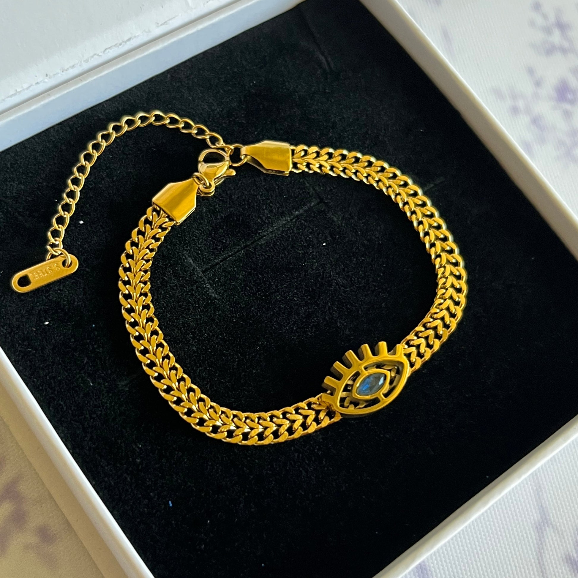 Channel protective elegance with this striking evil eye chain bracelet. Crafted from premium stainless steel with luxurious 18K gold plating, it merges contemporary design with timeless symbolism. The iconic evil eye motif serves as both a meaningful talisman and a sophisticated accessory, while the polished chain construction ensures a refined finish. An ideal choice for those seeking meaningful jewelry that doesn't compromise on style.