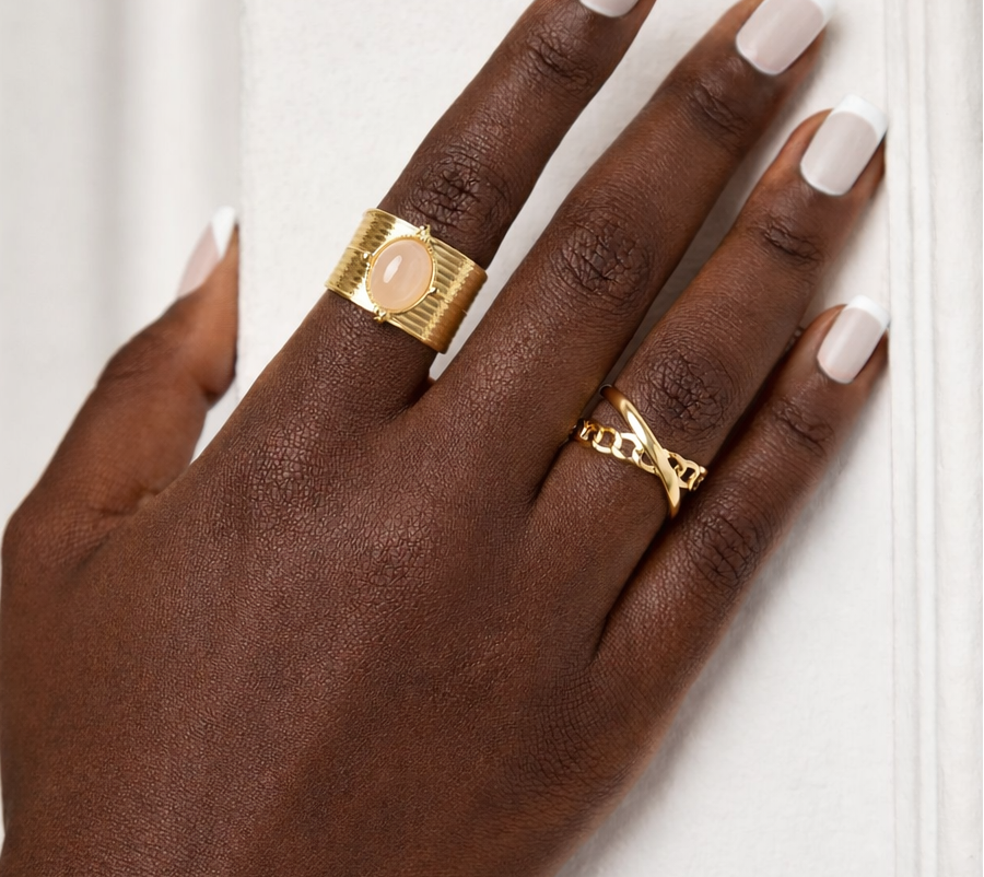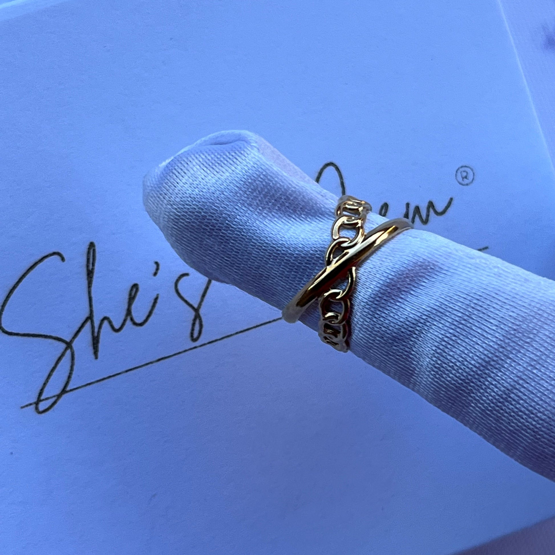 This elegant linked cuff chain ring showcases luxurious 18K gold plating on a foundation of durable stainless steel, creating a piece that merges contemporary design with timeless sophistication. The interconnected chain detail adds visual dimension while maintaining refined restraint, making it versatile enough for any occasion. Built to withstand daily wear without compromising its lustrous finish, this ring resists tarnishing and corrosion, ensuring enduring beauty. A distinguished choice for those who appreciate modern elegance paired with exceptional quality and lasting value.