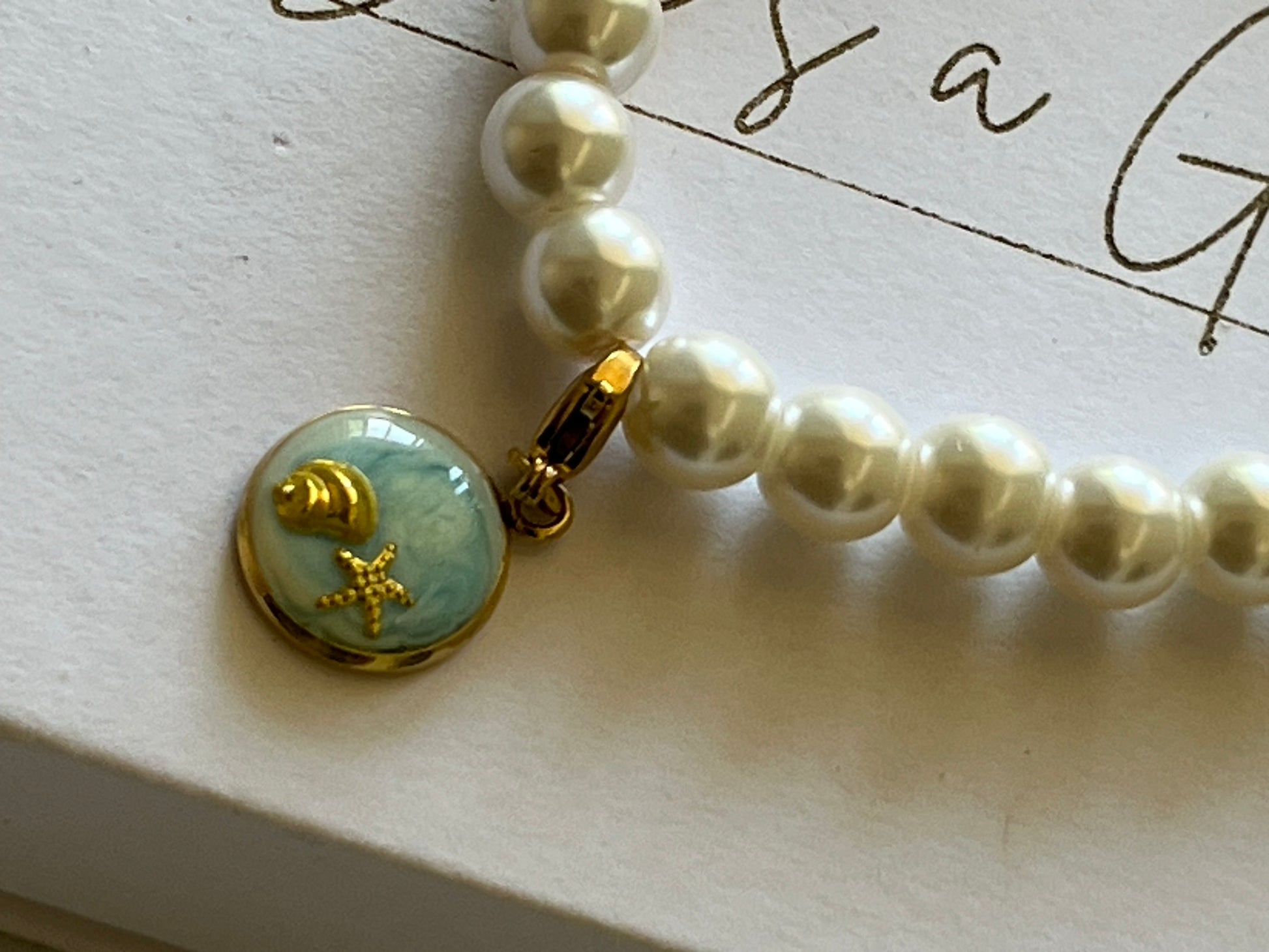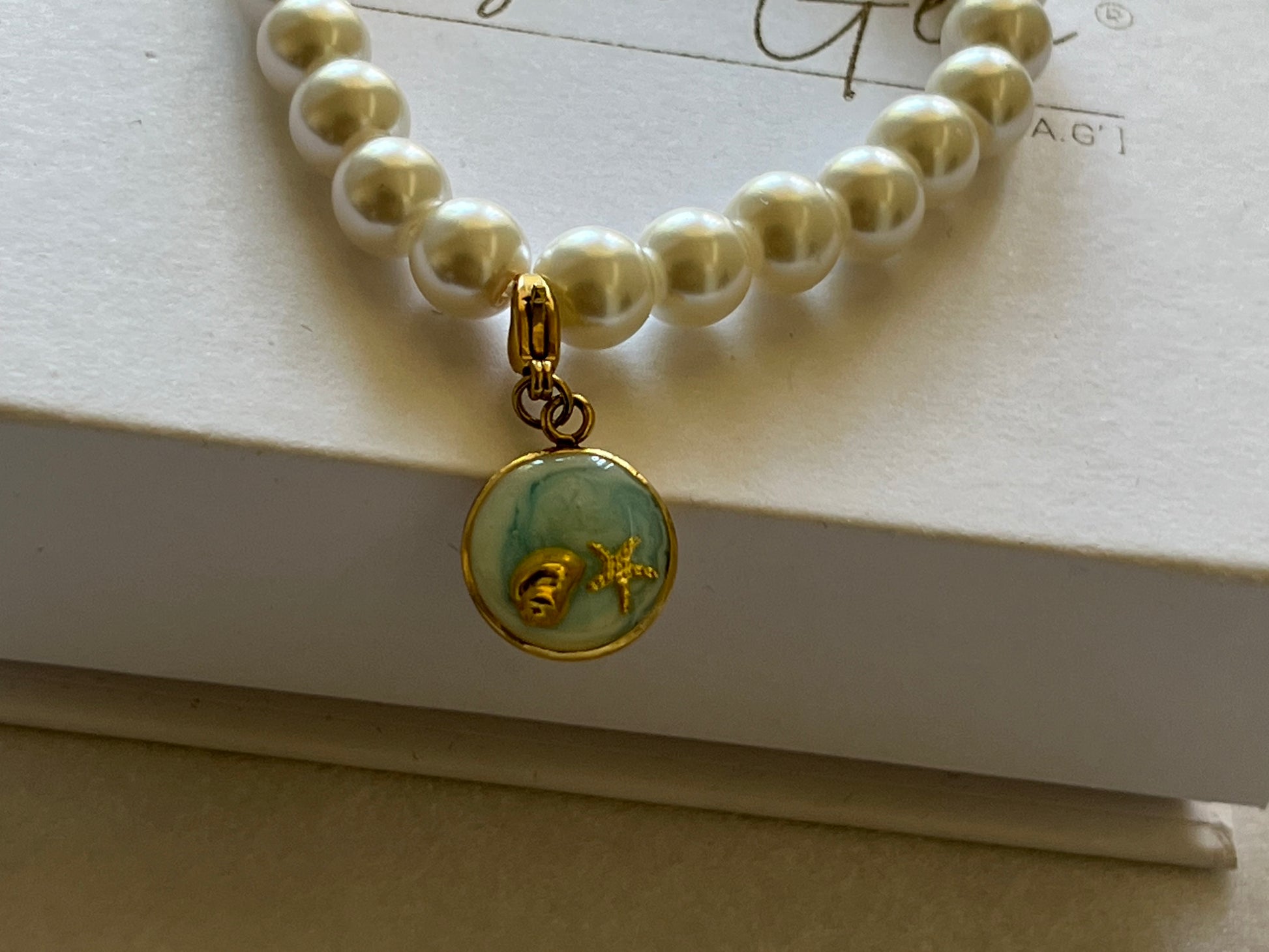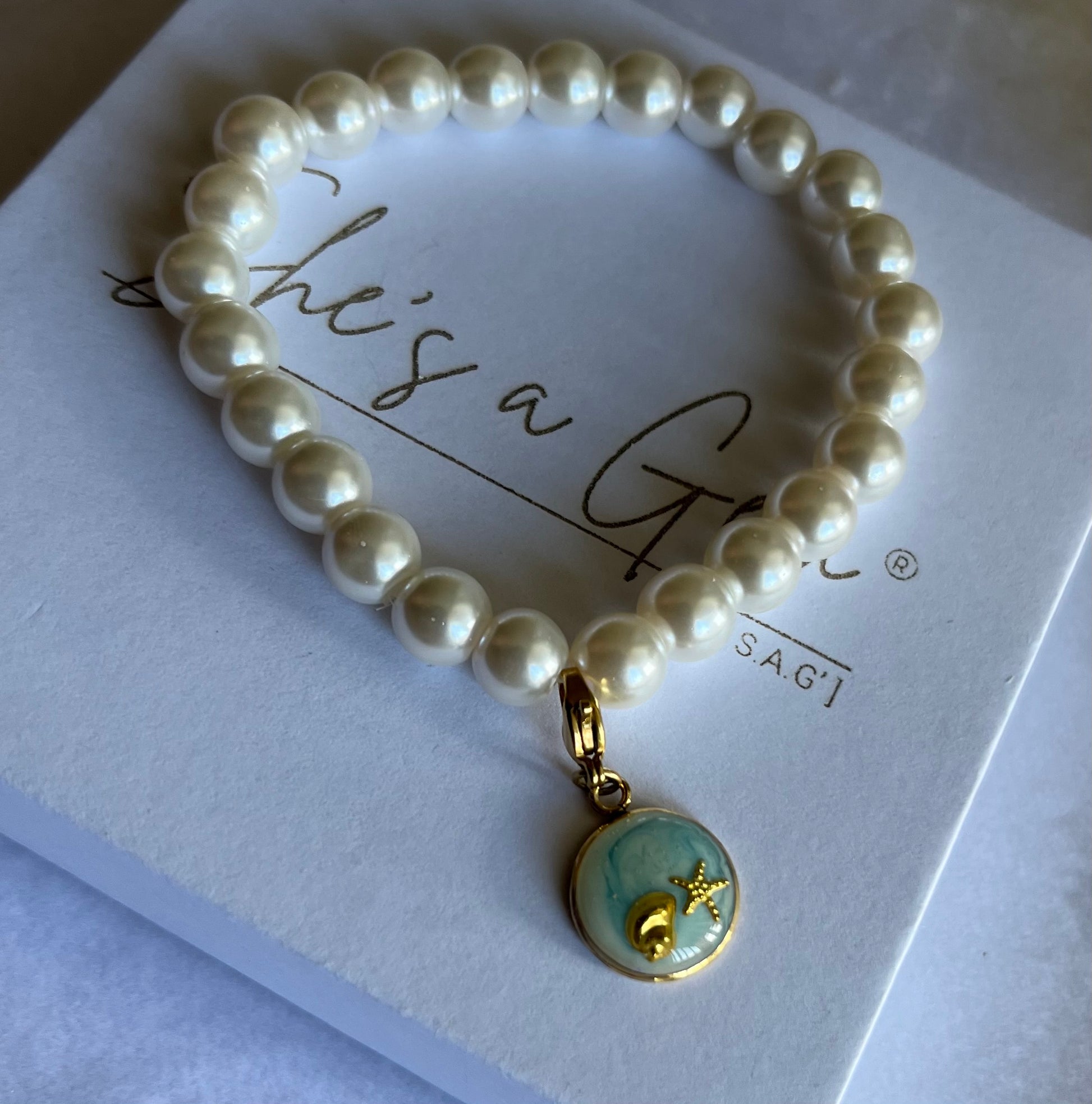 The Ocean's Glow Bracelet captures the serena beauty of the sea under moonlight. Designed with luminous pearls and a golden moon-and-starfish charm set against ad aqua backdrop, this radiant piece evokes both coastal elegance and celestial magic. A timeless treasure that shines with the brilliance of a gem.
