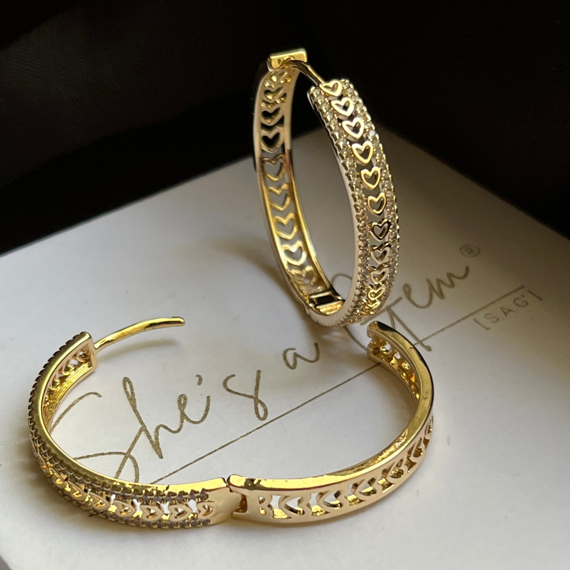 Romance meets radiance. The Amour Hoops features golden heart cutouts adorned with sparkling gems, creating a timeless design that embodies love and elegance. Lightweight yet striking, they're the perfect pair to wear from day to night, adding a touch of passion to every look.