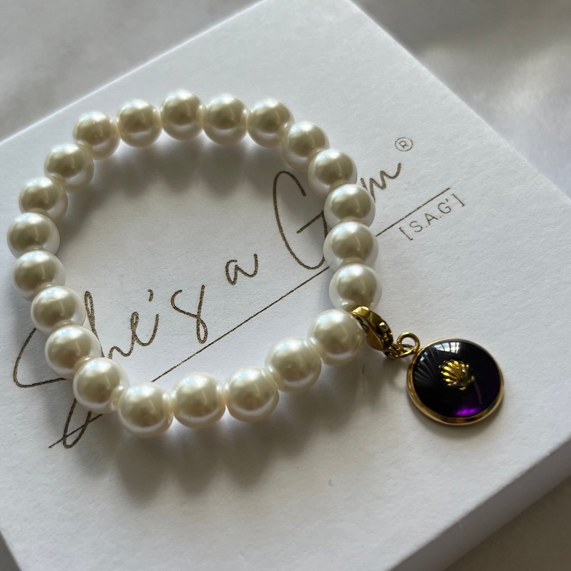 The Violet Tide Bracelet captures the beauty of twilight seas. With luminous pearls and a golden seashell charm set against a deep violet backdrop, this bracelet radiates both romance and mystery. A coastal-inspired gem that brings a touch of ocean magic to your style.