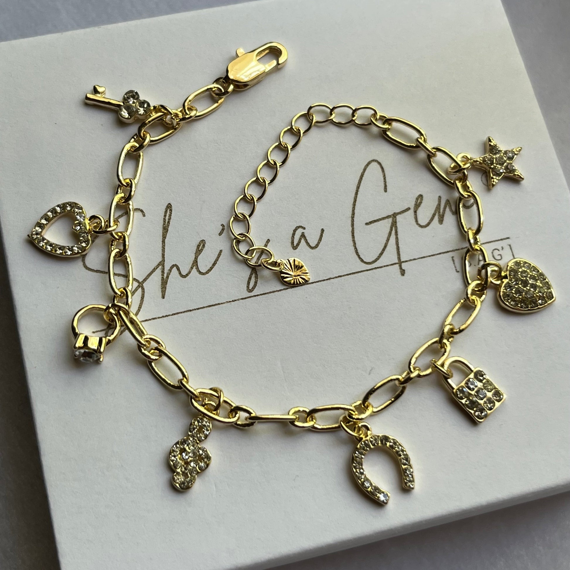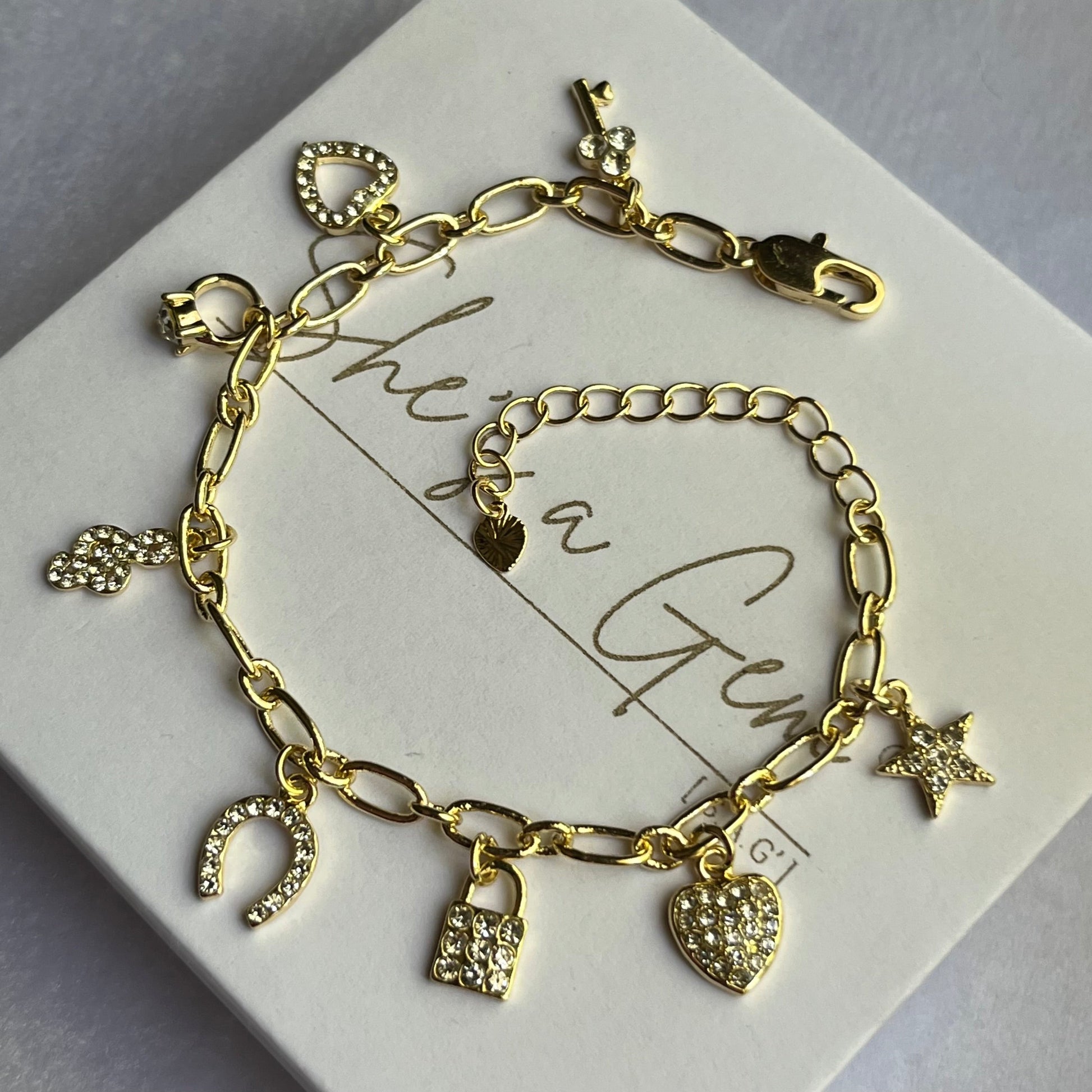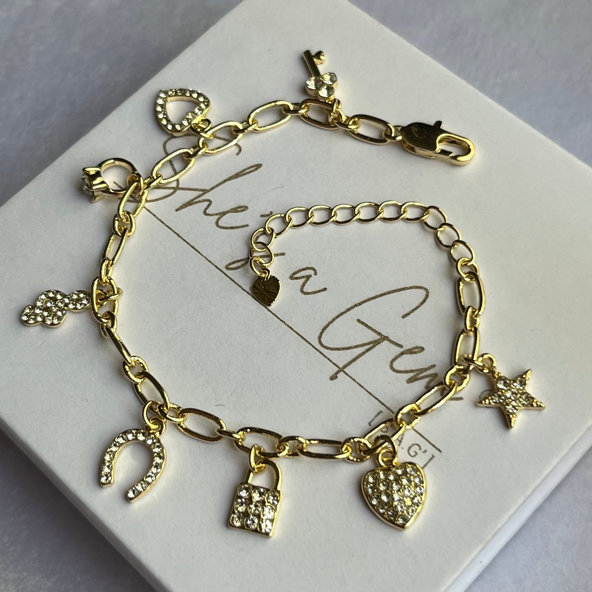 A radiant blend of gold and crystal-studded symbols, each charm tells a story of love, luck, and dreams. From hearts and stars to locks and keys, this bracelet captures life's most treasured moments and keeps them close. A timeless piece designed to sparkle with meaning wherever destiny leads you.
